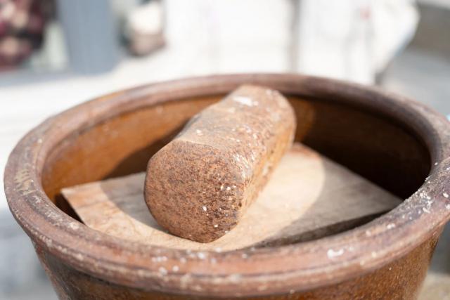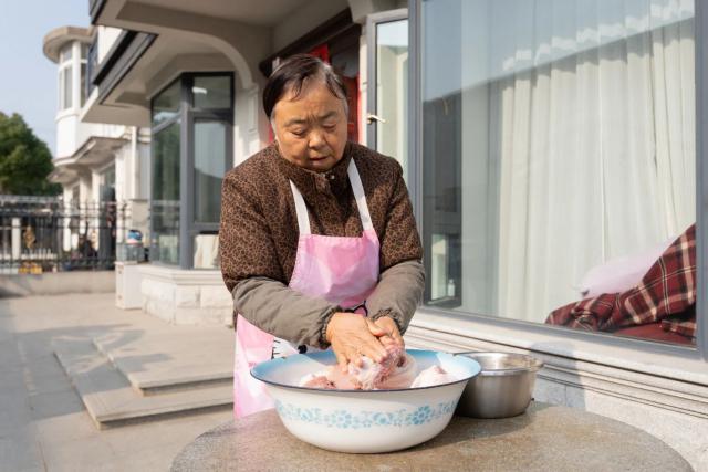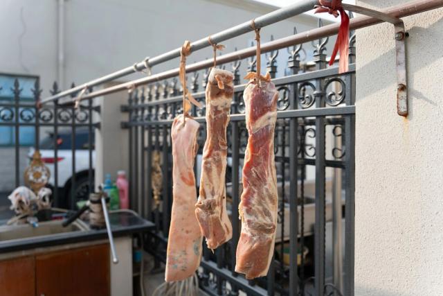 初步腌制好的肉块被整齐地码放进陶缸里压实,放置在阴凉的地方等待入味。几天后,就到了关键的晾晒环节。“晾晒咸肉得挑北风天,再配上冬日里干爽的太阳才行。”蔡琴芳介绍道。这个时候,邻里之间随口聊起的天气情况、穿绳晾晒的小技巧,成了村里常见的温馨画面。这种基于共同生活经验和节气传统的互动,简单又充满生活气息。