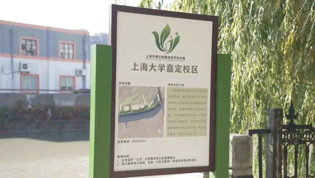 上海大学(嘉定校区)的单位附属绿地开放共享项目位于嘉定区城中路20号,通过拆除遮挡物、增加花坛坐凳和植物景观等退界改造措施,为周边居民提供了新的休闲健身场所。
