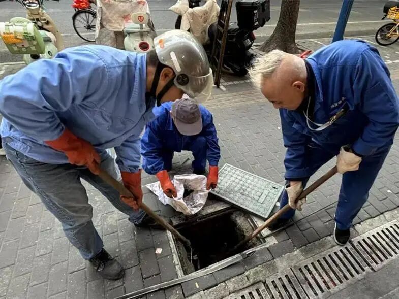 镇综合行政执法队闻风而动,会同淞南五村居民区物业工作人员携带工具赶到现场,对路面的污水和表层杂物开展紧急清理。经过工作人员的高效作业,路面返水情况得到了初步缓解,有效减少了对群众出行和商户经营的影响。考虑到管道内部的淤泥杂物是问题的根源,仅靠表层清理无法根治,街区党支部紧接着协调镇相关职能部门以及长宏实业公司,安排专业施工队进场开展深度疏通。