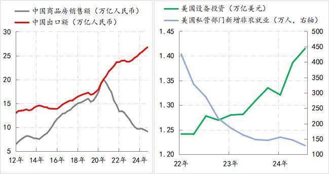 截至2025年三季度末,中国出口年化规模升至26.8万亿元,较四年前增加6万亿元,年均增长1.5万亿元;同期商品房年销售收入从20万亿元降至9万亿元。作为全球唯一工业门类齐全的国家,中国在满足外需上展现出强弹性,即便外部环境巨变,出口仍保持增长,从总量上对冲了房地产调整的影响。