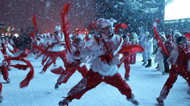 作为首批国家级非物质文化遗产,安塞腰鼓以刚劲奔放的风格闻名全国。在雪乡零下20摄氏度的严寒环境中,队员们身姿矫健如飞燕,红绸翻飞似烈火。他们时而跨步腾跃,鼓点密集如同骤雨;时而稳扎马步,鼓声沉雄好似惊雷。队形在雪地中不断变换,时而如长龙游走,时而如星阵铺开。队员们脸上凝结着霜花,却掩盖不住眼底的热忱,每一次挥槌都力道十足,将黄土高原的豪迈与坚韧,尽情绽放在白山黑水之间。