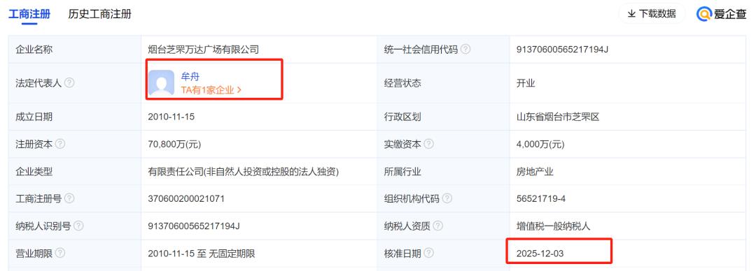 12月2日,爱企查信息显示,烟台芝罘万达广场有限公司出现工商变更,新华保险旗下的坤华(天津)股权投资合伙企业(有限合伙)与坤元辰兴(厦门)投资管理咨询有限公司退出股东名单,大连万达商管旗下的上海万达锐驰企业管理有限公司成为新的全资股东,吴华接任法定代表人。