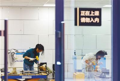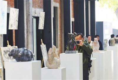 游客观赏雕塑展览,在静态的造型中感受如同乐章般流动的艺术韵律。