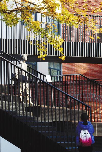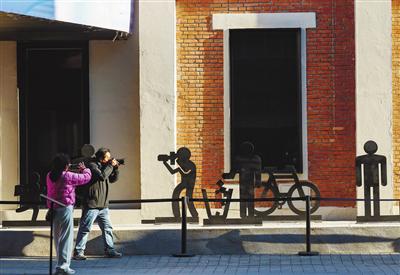街区里的艺术雕塑“人”与真实的行人相互映衬,构成奇妙的画面。