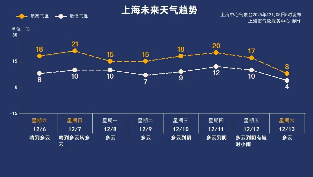 下周初,一股弱冷空气将影响上海,最高气温回落至15℃,最低气温变化不大。周中气温会再度回升,但下周末将有较强冷空气来袭,届时周六全天气温将降至10℃以下。