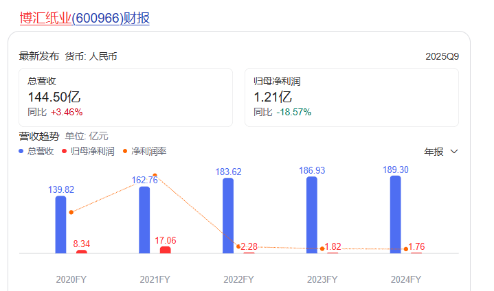 博汇纸业的扩产行动与其近年“增收不增利”的财务状况密切相关。公司净利润已连续3年大幅下滑,2024年降至1.76亿元;今年前三季度营收增长3.46%,但净利润同比下滑18.57%至1.21亿元。