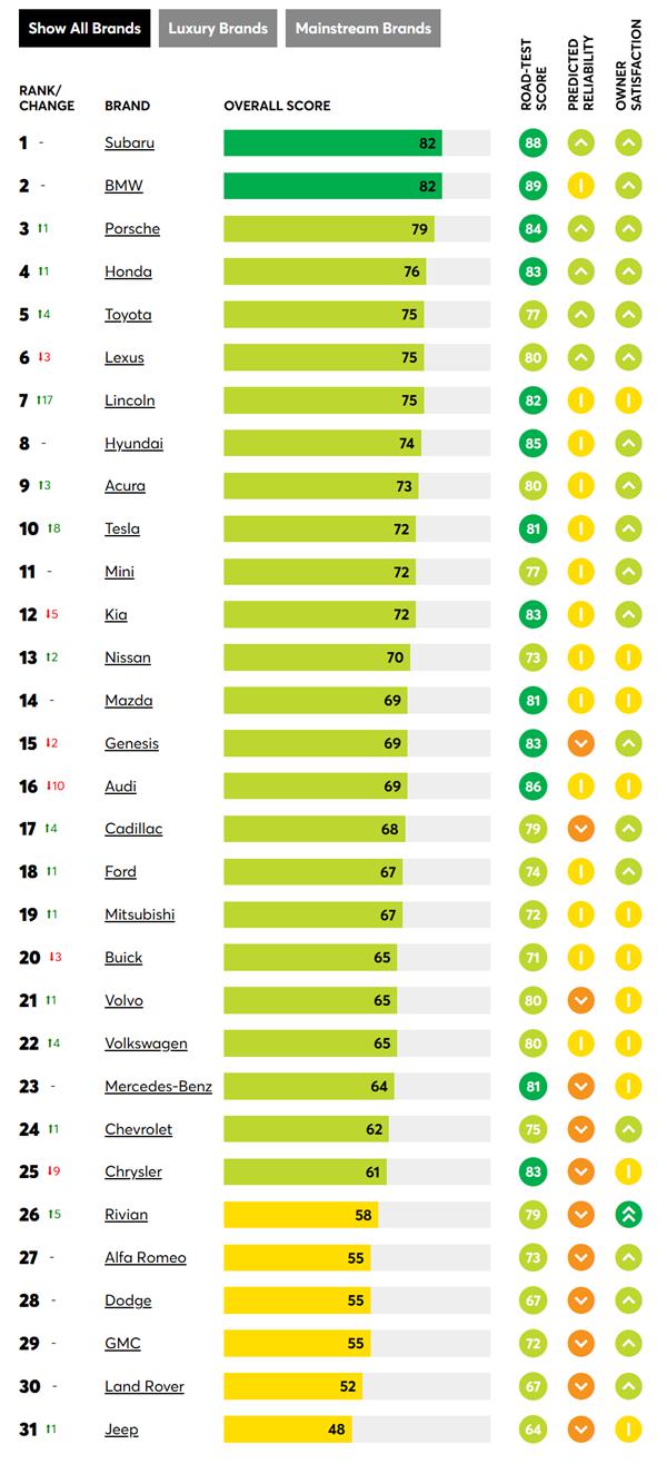 《消费者报告》2025美国最佳汽车品牌出炉:斯巴鲁登顶 特斯拉跻身前十