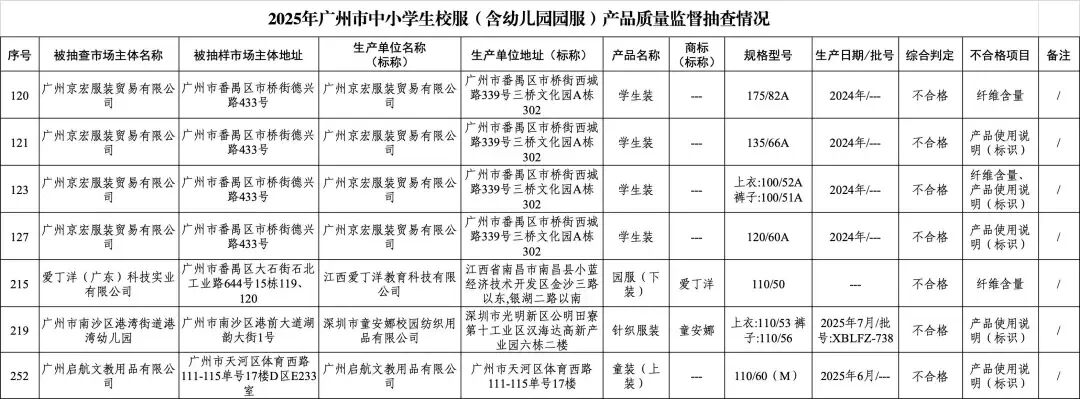 12月4日,广州市发布中小学校服质量抽查情况通告,共发现7批次不合格产品,剔除纯标识问题后,实物质量不合格的有3批次,不合格项目为纤维含量。此次抽查覆盖广州市行政区域内50家校服(含幼儿园园服)的生产、销售单位及学校,共抽检256款产品。