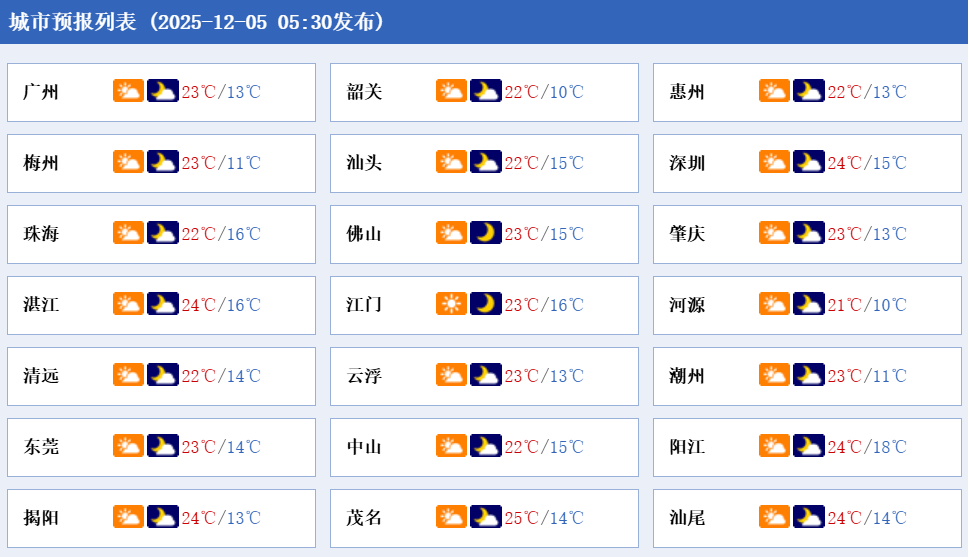5日,全省大部气温缓慢回升,雷州半岛为阴天间多云,其余市县多云间晴。最低气温方面,粤北大部、珠三角北部市县8~12℃,粤西17~20℃,其余大部分市县12~15℃。