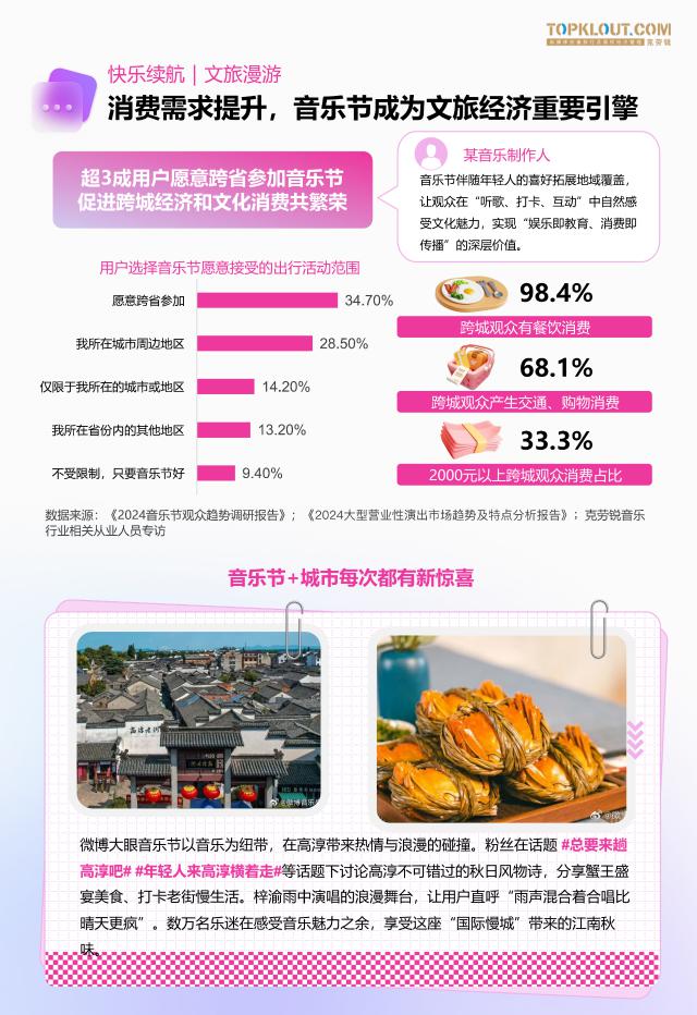 《报告》显示,今年音乐节呈现出明显的“下沉”趋势,三线及以下城市举办场次大幅增加,且超3成用户愿意跨省参加音乐节,98.4%的跨城观众会进行餐饮消费。