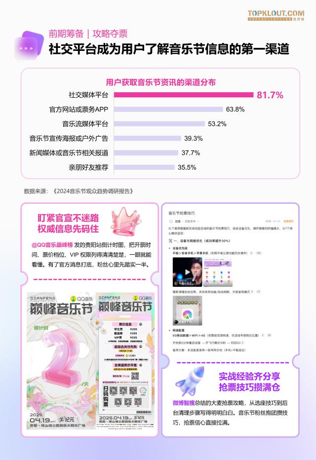 数据显示,81.7%的用户通过社交平台了解音乐节信息。开票前,粉丝在社交平台关注官方账号发布的阵容信息、票价档位;抢票时,网友自发分享“平板比手机抢票快”“5G信号更稳定”等实战经验,帮助彼此成功购票。
