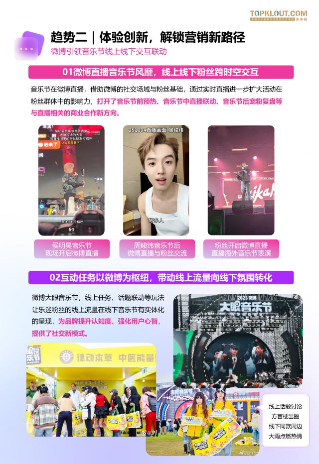 其中,直播音乐节成为流行趋势之一。侯明昊在音乐节现场开启微博直播,邀请线上粉丝“云参与”;周峻纬在音乐节后直播与粉丝复盘演出,分享幕后趣事,进一步增强粉丝粘性;还有粉丝自发直播海外音乐节表演,让国内乐迷同步感受现场氛围。