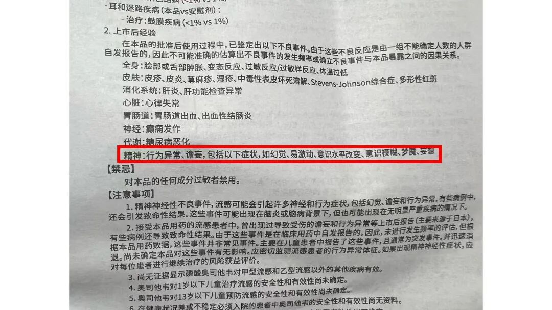 奥司他韦说明书的“不良反应”栏提到,药物批准后使用过程中发现包括行为异常、谵妄等精神相关不良反应。西安交通大学附属儿童医院急诊科主任苏宇飞表示,奥司他韦进入中国超20年,临床中确实遇到过相关精神症状病例,但极为罕见,他多年来遇到的不超过两例,其中一例是孩子特别烦躁、哭闹不安。