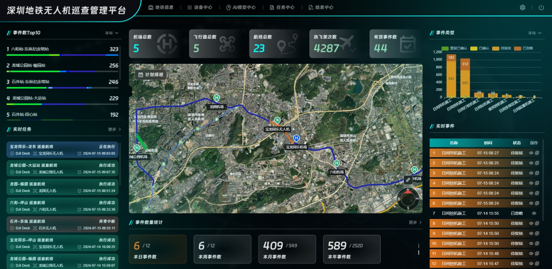 在深圳地铁16号线,每天有5台无人机从5个无人机机场起飞,每3小时巡查一次沿线29公里的安保区范围,自动回传巡航抓拍的图片和视频,半小时内即可完成全线安保区覆盖。巡查中,无人机借助AI智能识别预警技术,能自动精准识别违法施工、设备隐患等安全问题并及时预警。