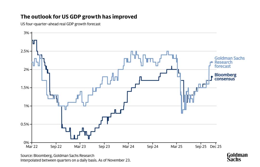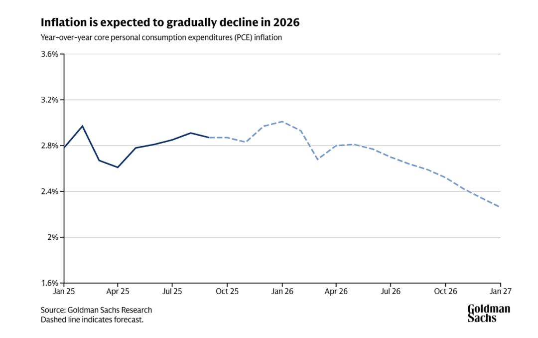 高盛预测2026年美国经济增长将加速至2.0%至2.5%区间。这一增长预期主要得益于两大因素:一是关税影响减弱,降低了供应链成本压力;二是税收减免政策与金融条件进一步宽松。这些有利因素预计将推动就业增长,使失业率稳定在略高于2025年9月4.4%的水平。