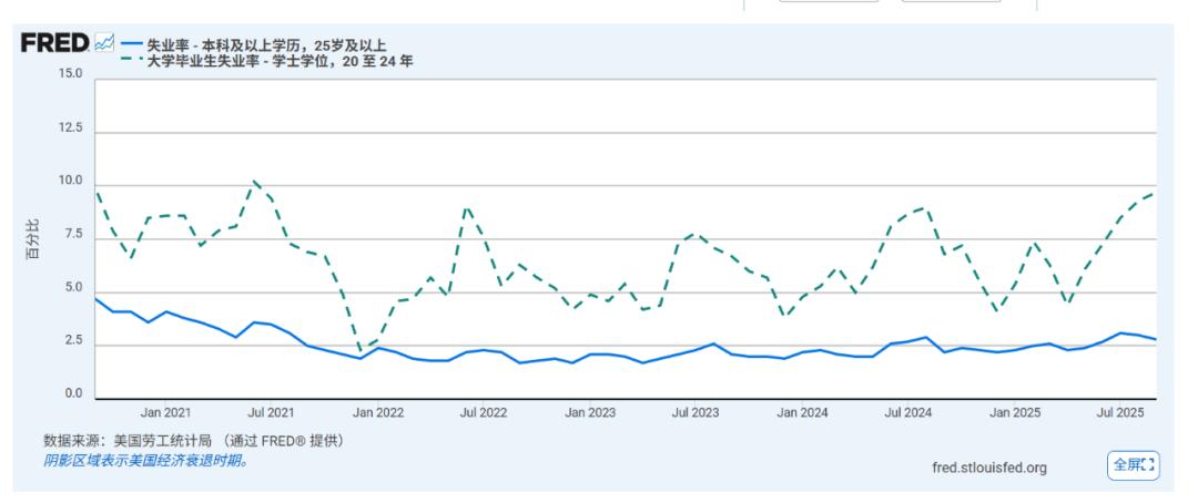 25岁及以上大学毕业生9月失业率达2.8%,较2022年低点上升约50%。