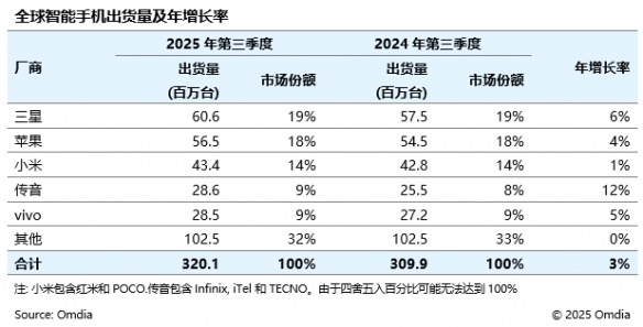 尽管根据Omdia数据,2025年第三季度,三星以19%的份额稳居全球智能手机出货量榜首。但这份全球领先的成绩并没有消除其深层的焦虑。
