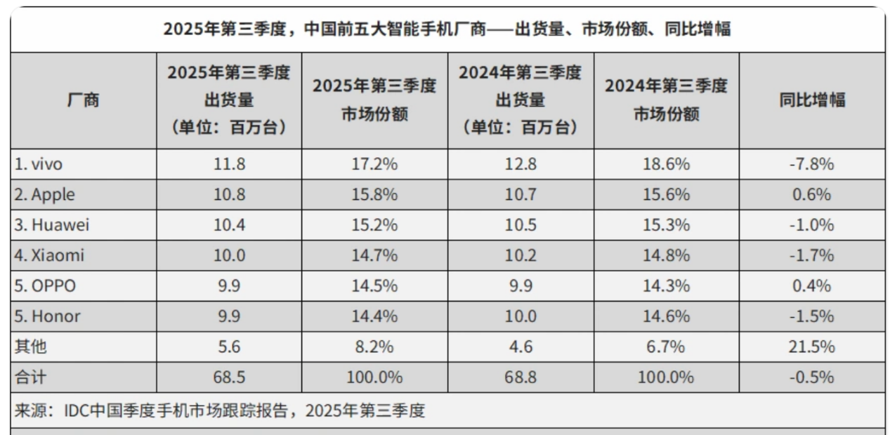 根据IDC最新数据,2025年第三季度中国手机市场前五名中,没有三星的身影。这与它仍是全球第一的地位形成了鲜明对比。