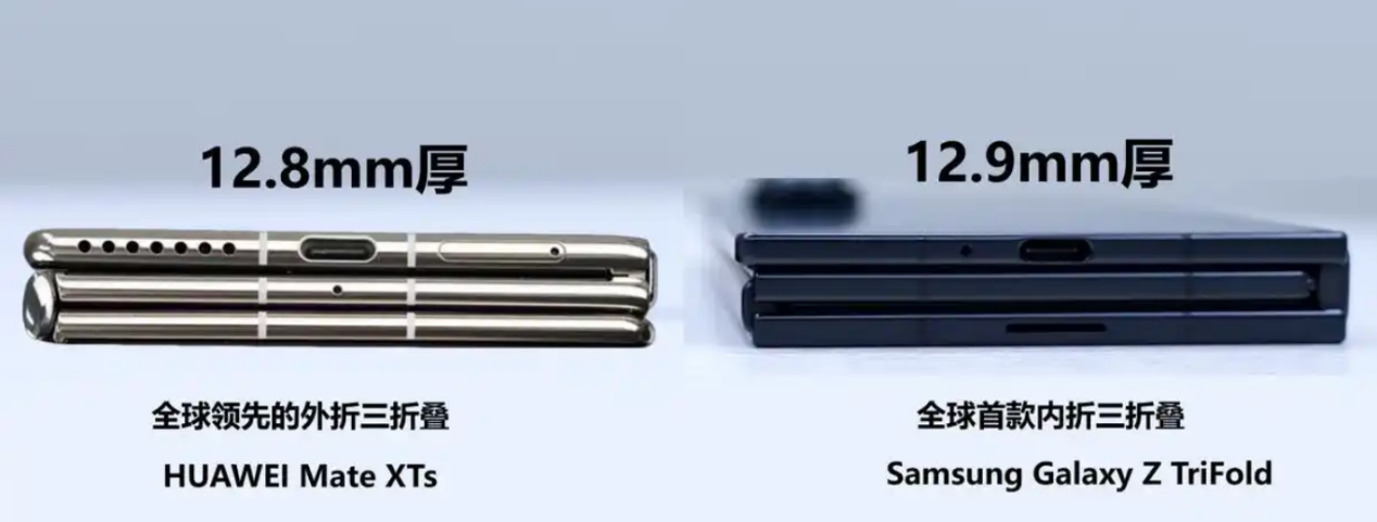 从设计角度来看,三星和华为的三折叠手机有着明显区别。三星的TriFold采用双侧内折铰链设计,而华为Mate XT在折叠时呈现出独特的Z字形结构。值得注意的是,TriFold展开状态下最薄处仅3.9毫米,内部配备了5600毫安时的电池,创下了三星折叠屏手机电池容量的最大纪录。