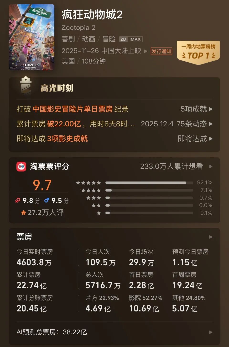 11月26日上映首日,该片斩获2.28亿元票房。首个周末,影院排片几乎被它占据,部分热门时段甚至半小时一场。北京颐堤港CGV星星影城外,捧着主角形象爆米花桶的年轻人、cos成朱迪的孩子与家长随处可见。