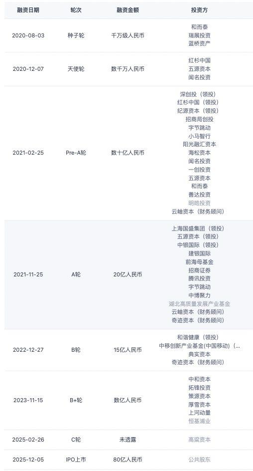 2020年8月种子轮获和而泰等千万投资;2020年12月天使轮引红杉中国等入局;2021年2月Pre-A轮获深创投等数十亿投资成独角兽;2021年11月A轮融资20亿,上海国盛等产业资本加入;2022年12月B轮融资15亿,估值达240亿;2023年11月B+轮获中信资本等加码;2025年2月C轮高粱资本入局;2025年12月IPO募资80亿,公募与战略投资者认购推动股价暴涨。