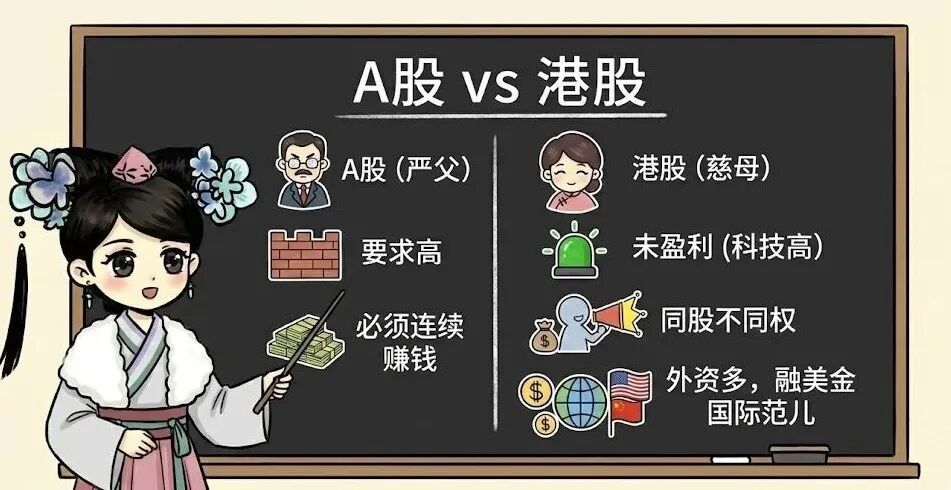 A股的上市要求比较严格,就像“严父”一样,必须连续盈利才能上市;而港股则相对宽松,就像“慈母”,哪怕企业还在亏钱搞研发(未盈利状态),只要科技含量够高,也能给开绿灯允许上市。