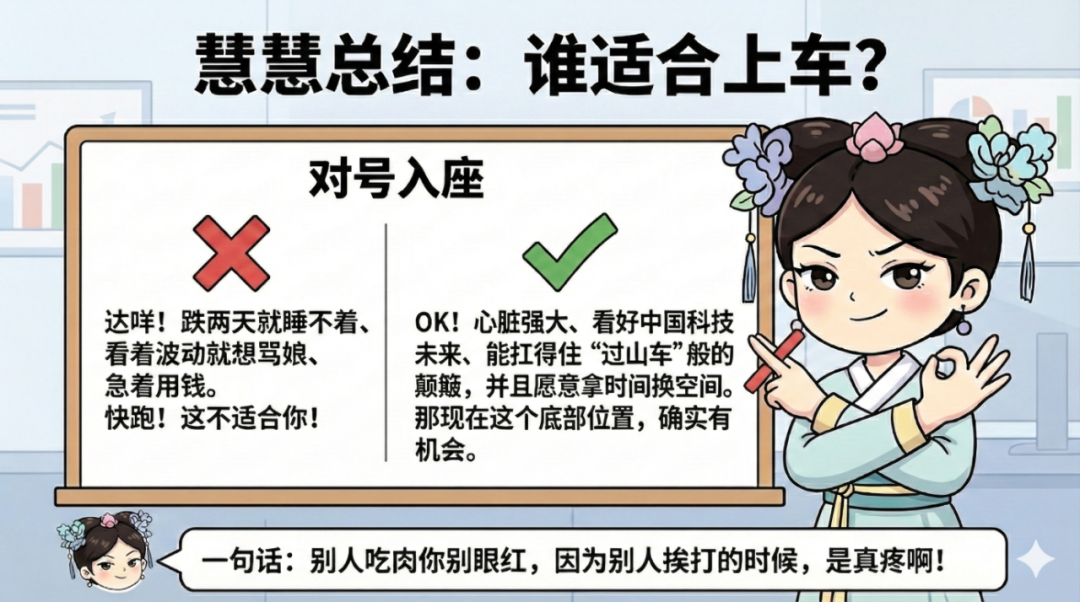 ✅ 如果你是这样的:心理承受能力强、看好中国科技的未来、能扛得住“过山车”似的波动,并且愿意用时间换收益。那现在这个点位,确实有机会。