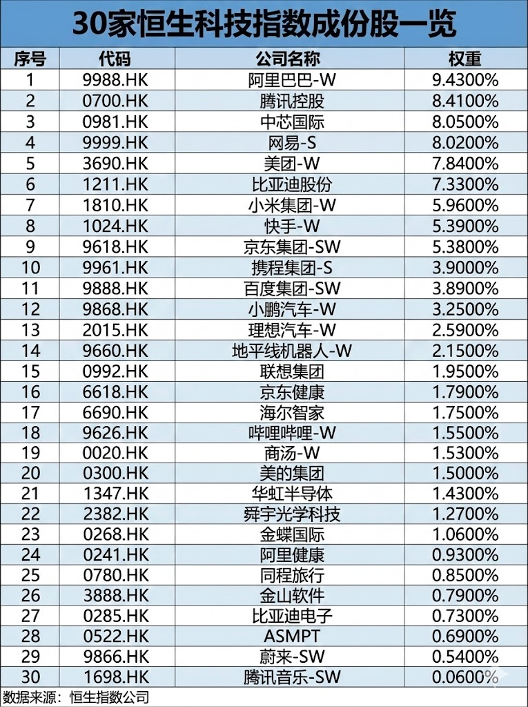 先弄明白咱们买的到底是什么。恒生科技指数,简单来说,就是在香港上市的30家规模最大的科技领军企业组合。