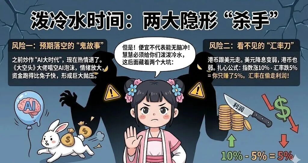 风险二:看不见的“汇率影响”。这一点很多新手都不知道!港币是和美元挂钩的。现在美元有降息预期(会走弱),港币也会跟着走弱。扎心的公式:指数涨10% - 汇率跌5% = 你实际只赚了5%。这就是为啥有时候指数涨了,但你的基金净值却没怎么变化。汇率正在悄悄侵蚀你的利润!