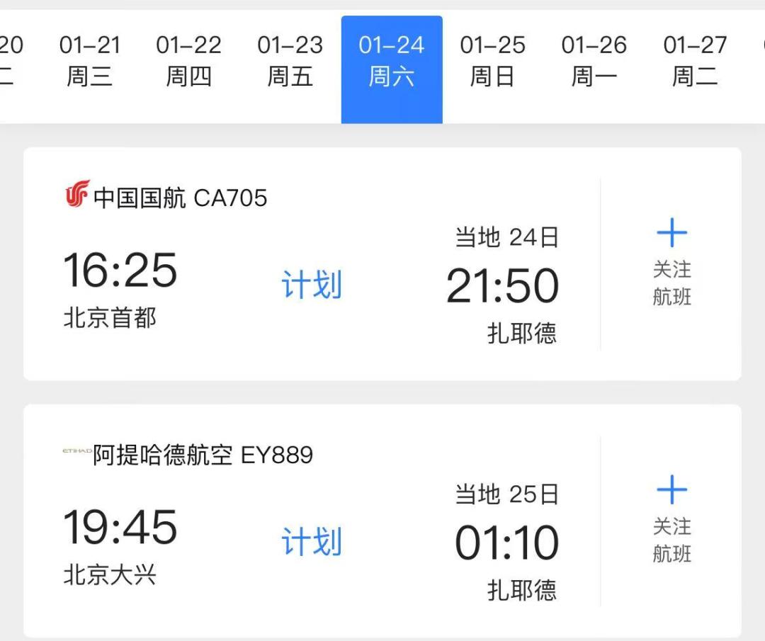 北京航线的竞争将更趋激烈。阿提哈德目前运营北京大兴至阿布扎比每日一班航班,而国航计划2026年1月24日开通北京首都至阿布扎比航线,每周四班,这意味着两家航企将在首都机场与大兴机场形成“双场对垒”。