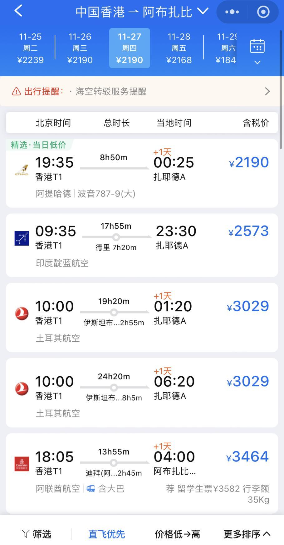 从OTA平台的机票价格来看,该航线推出了超低直飞价,远超众多中转票的性价比,以11月27日为例,香港飞阿布扎比的单程经济舱票价2190元起。