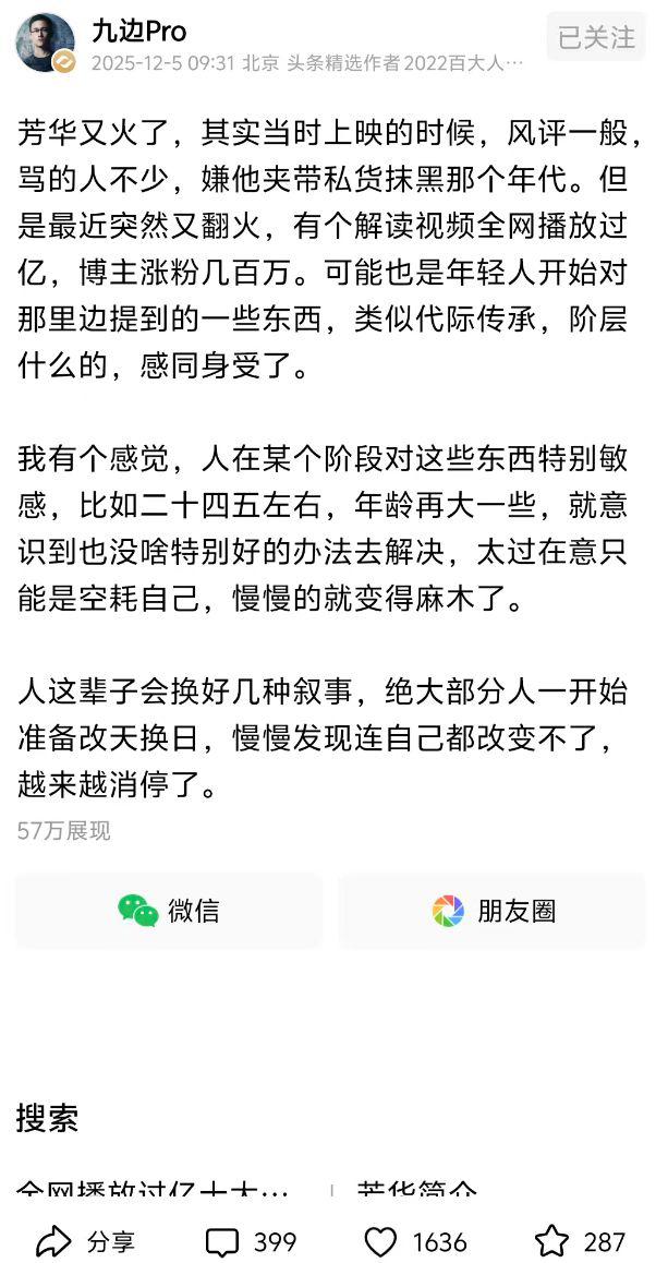 这是头部自媒体人九边针对“《芳华》又火了”这一现象的讨论内容。