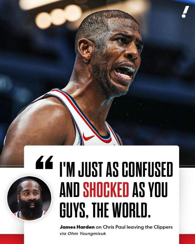 此前哈登在回应保罗与快船突然分道扬镳一事时表示:"睡醒看到新闻,我和全世界一样感到惊讶和疑惑。"