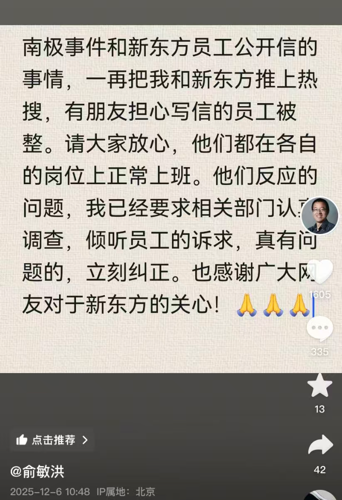 12月6日,新东方集团董事长俞敏洪针对近期引发关注的南极事件及员工公开信一事作出回应。他表示,有朋友担忧写下公开信的员工会受到不公正对待,特此说明这些员工目前都在各自岗位正常工作。对于员工在信中反映的问题,俞敏洪已要求相关部门展开认真调查,倾听员工的合理诉求,若查实存在问题将立即予以纠正。