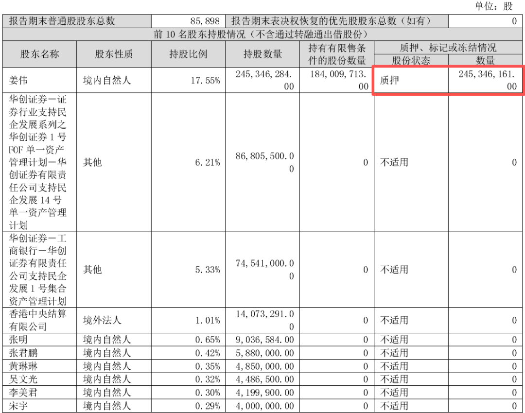 三季报显示,姜伟持股17.55%(几乎100%质押),华创证券持股11.54%,为前两大股东。
