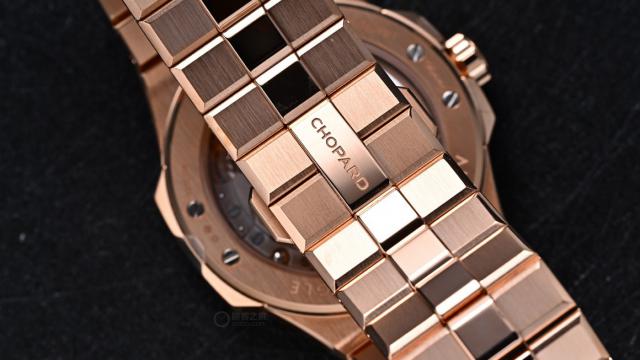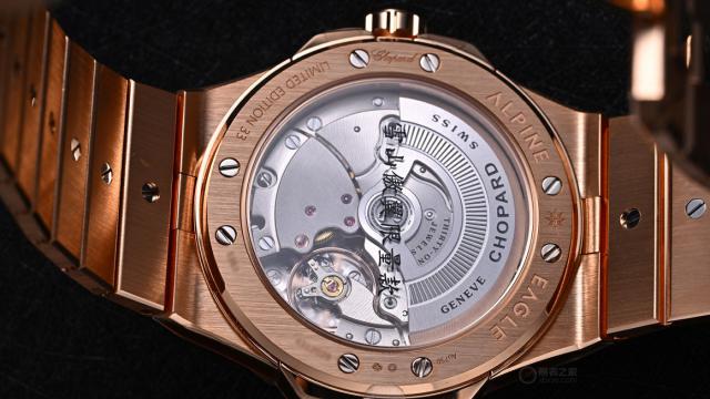 翻转至腕表背面,透过蓝宝石水晶底盖可清晰看到机芯的内部结构。摆轮采用四轮辐设计,配有带螺丝的微型调速器,确保调校稳定;机芯夹板经过放射状日内瓦纹打磨,边缘倒角处理细腻,螺丝头抛光圆润。萧邦在细节装饰上从不吝啬,即便肉眼难以察觉的部位,也保持着一贯的高标准。