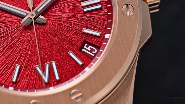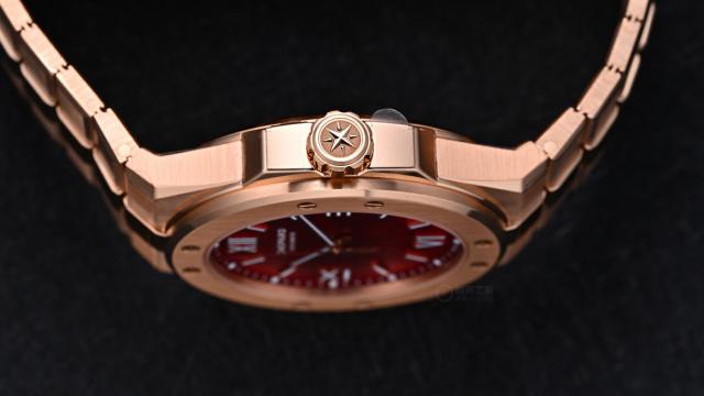 整枚腕表直径41毫米,厚度仅9.7毫米,18K玫瑰金材质的温润光泽与丹霞红表盘的暖调相互映衬,让这款运动腕表散发着不经意的奢华感。表圈采用经典的八颗螺丝固定设计,每颗螺丝的方向都经过精准校正,与表壳走向保持一致。