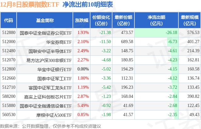 同时,有232只股票指数ETF出现资金净流出,国泰中证全指证券公司ETF(512880)净流出最多,份额减少21.38亿份,净流出26.18亿元。