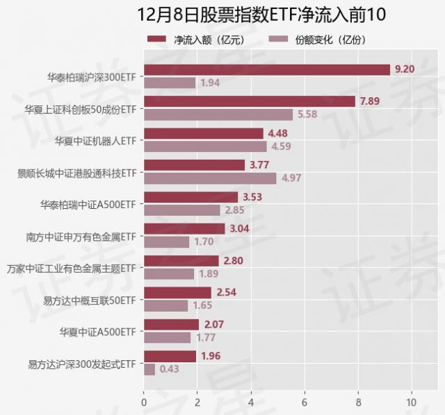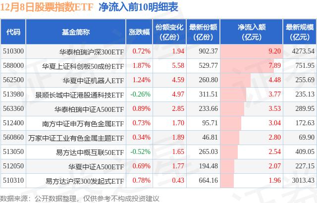 在资金流动的具体基金方面,当日有172只股票指数ETF出现资金净流入,其中华泰柏瑞沪深300ETF(510300)净流入额最高,份额增加1.94亿份,净流入9.2亿元。
