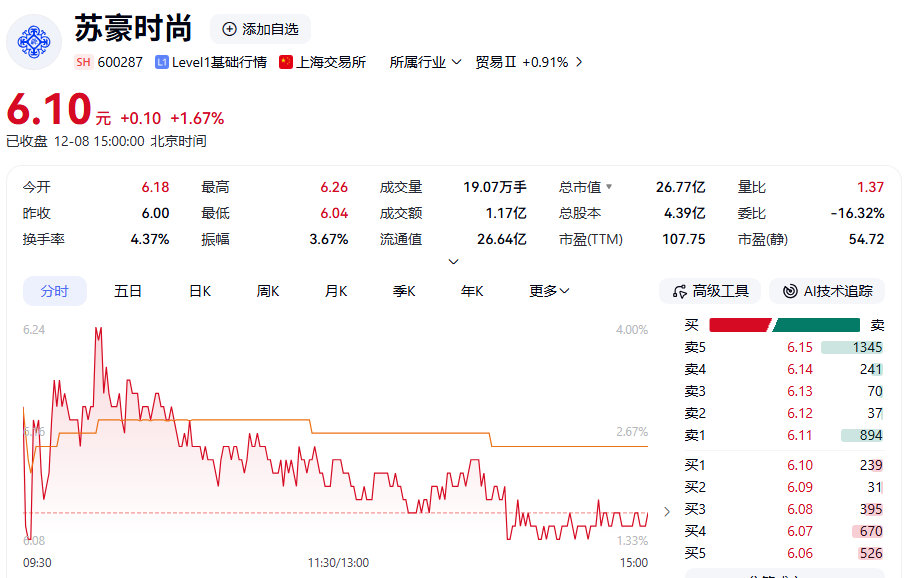 截至12月8日收盘,苏豪时尚股价报6.1元/股,总市值达26.77亿元。