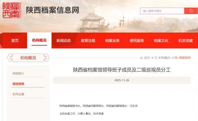 近日,陕西档案信息网"局馆领导"一栏更新显示,马生龙现任陕西省委副秘书长、陕西省档案局局长、陕西省档案馆馆长。(陕西档案信息网)