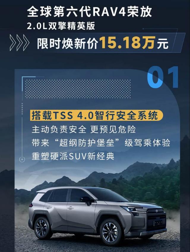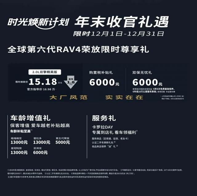 一汽丰田在12月1日至12月31日期间推出了限时补贴活动。全新一代RAV4荣放的限时焕新价为15.18万元,相当于直降1.8万元。此外,2026款格瑞维亚、2026款皇冠陆放以及普拉多的补贴最高可达13000元。