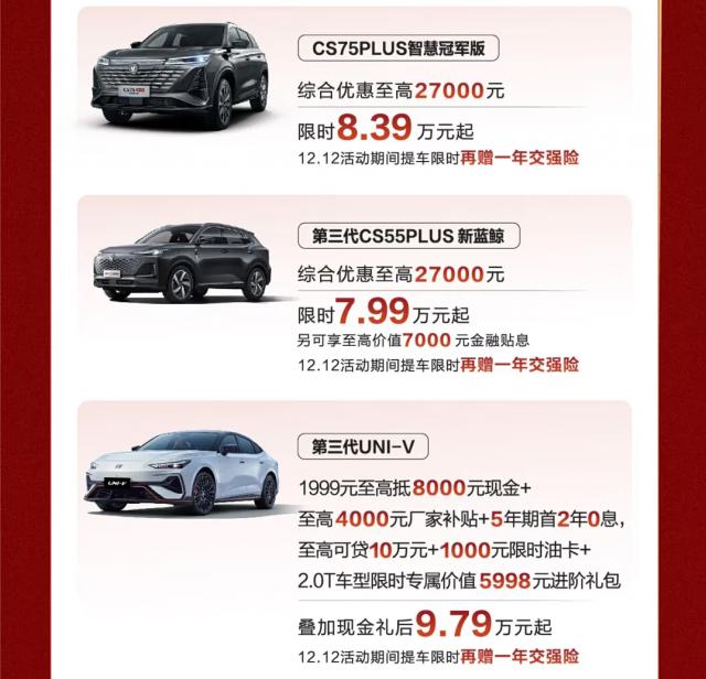 不同车型的优惠力度各有不同,其中作为销量主力的CS75PLUS系列,第四代车型现金优惠1.2万元,第三代车型现金优惠则高达3万元。值得一提的是,所有参与优惠的车型还都赠送一年交强险,这也算是一种变相的现金优惠。