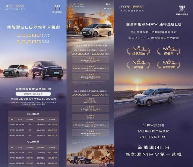 别克GL8陆尚和GL8陆尊推出了年末限时购车福利:即日起至12月31日,可享受5000元定金抵10000元的膨胀购车金,以及10000元置换金等优惠。同时,年底前购车还能享受购置税全免。