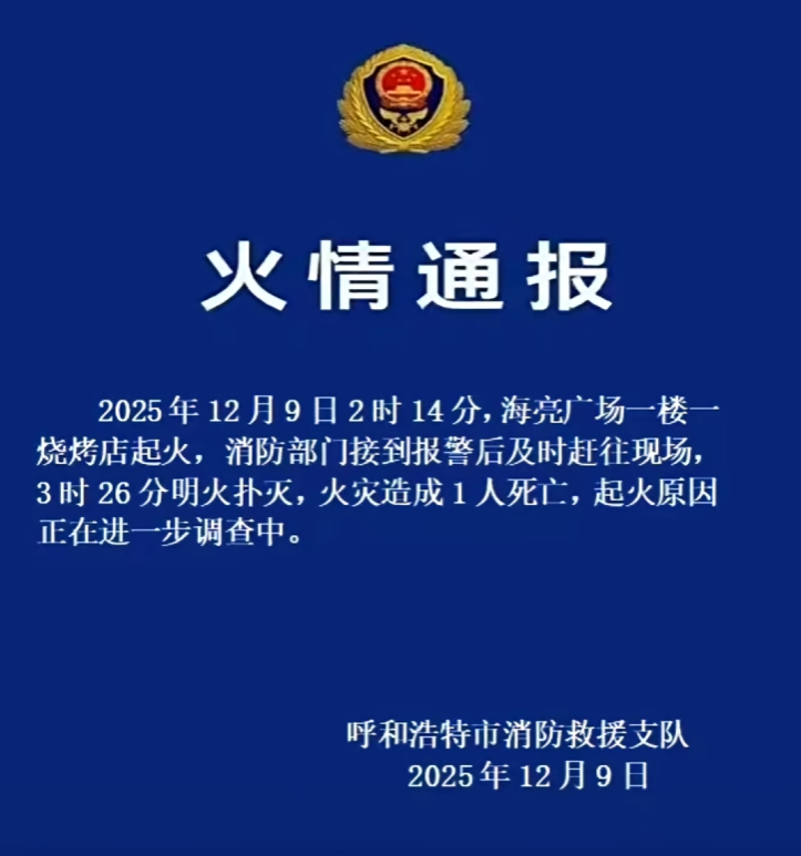 12月9日凌晨2时左右,内蒙古呼和浩特市海亮广场一楼的一家烧烤店发生火灾,事故造成1人不幸遇难,目前起火原因正在进一步调查中。