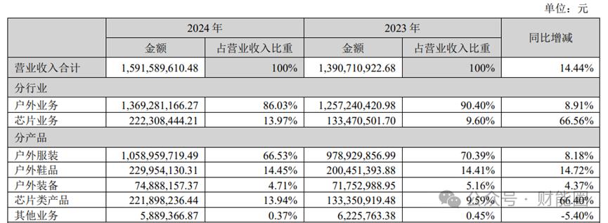 通过陆续收购3家芯片公司,探路者形成了“户外+芯片”双主业发展模式。2024年,公司总营收为15.92亿元,其中户外业务占比86.03%,芯片业务占比13.97%。