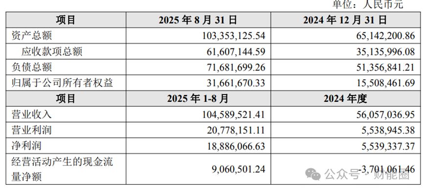 财务数据显示,截至报告期末,上海通途的资产总额为1.03亿元,归属母公司所有者权益为3166万元。业绩方面,2024年公司实现营收5606万元,净利润554万元;今年前8个月实现营收1.05亿元,净利润1887万元。