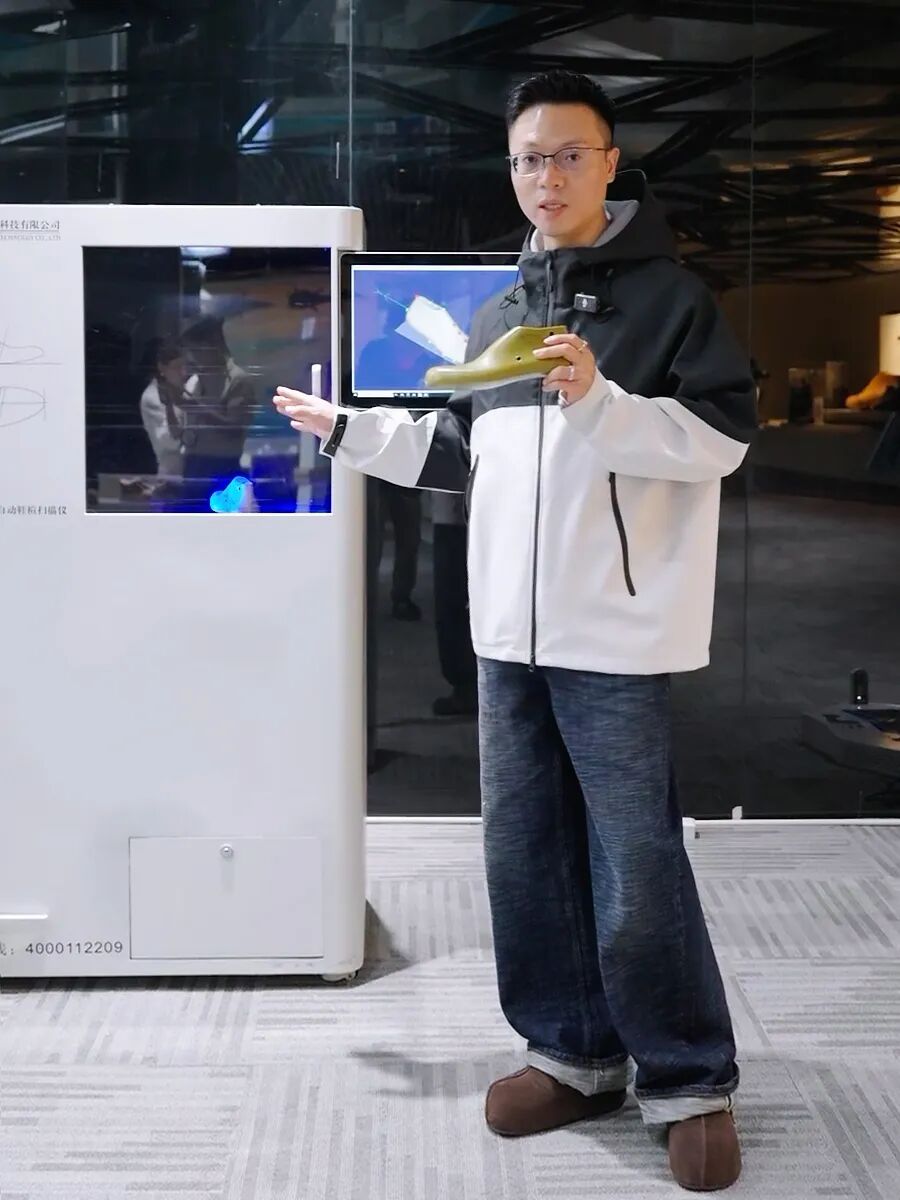 *钱帆在直播间介绍数字化鞋楦扫描设备