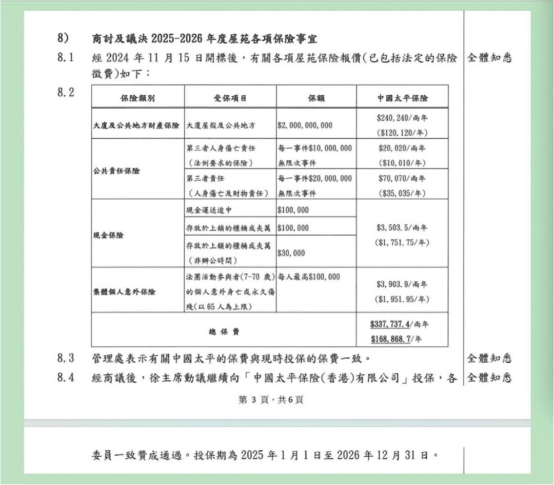 具体的保险方案如下图所示:从保险方案来看,太平香港承保险种总计包括大厦及公共地方财产保险、公共责任保险、现金保险和集体个人意外保险,这四类保险的总保费为33.77万港元/两年。其中,大厦及公共地方财产保险保额为20亿港元,对应保费为24.02万港元/两年,受保项目为大厦房屋及公共地方;集体个人意外保险的受保项目为法团活动参与者(7岁-70岁)的个人意外身亡或永久伤残(以65人为上限),保额为每人最高10万港元,对应的保费为3903.9港元/两年等。