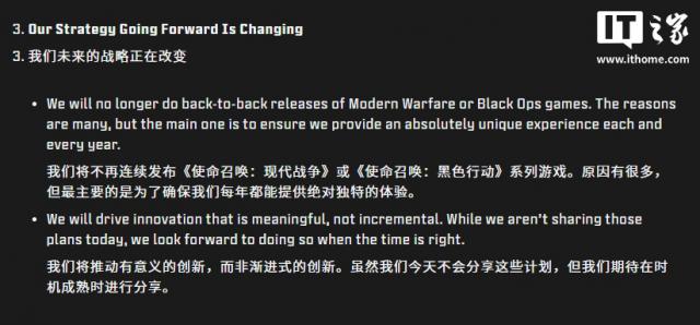 IT之家12月10日消息,动视(Activision)在当地时间周二对外宣布,旗下《使命召唤》(Call of Duty)系列后续推出的作品,将不再采用连续推出《现代战争》(Modern Warfare)或《黑色行动》(Black Ops)子系列游戏的模式。回顾该系列过往,此前规划的四部作品依次为2022年的《现代战争II》、2023年的《现代战争III》、2024年的《黑色行动6》以及2025年的《黑色行动7》。不过依据官方博客发布的内容,未来公司致力于“每年都为玩家打造真正独特且别具一格的游戏体验”。